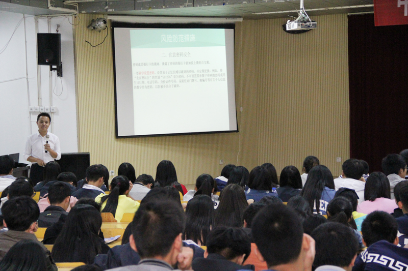 程学茂通过通俗易懂的讲解方式,配合典型案例和图片,图文并茂的向在座大学生们分析了常见诈骗案例、介绍了风险防范措施、助学贷款相关知识和个人信用卡使用等日常金融常识。
