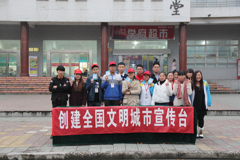 为了增强我院师生对池州市创建全国文明城市的氛围,弘扬社会主义核心价值观。11月16日开始,院团委组织学生会、社团、广播站干部在院食堂广场前,设立创建全国文明城市宣传台,活动现场吸引大量师生向前来咨询。